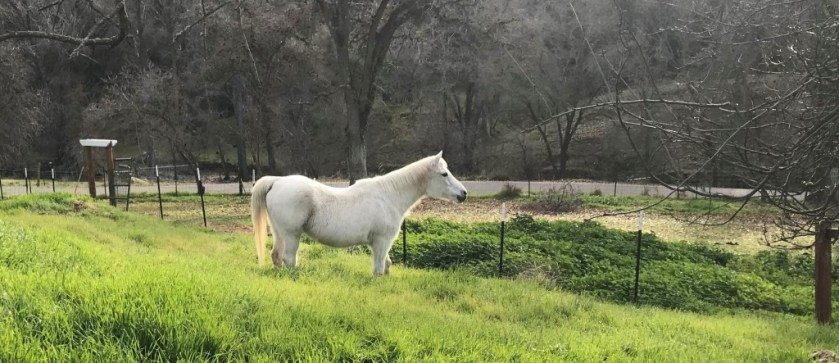 She stands alert in her green grass pasture, attention drawn to the world of sounds, scents, and movement around her. Brush in hand, I see the long white hairs of her winter coat lifted to the warmth of the sun. I smooth the hair with the brush, trying to reach her skin where the gentle bristles relieve itching, laying the hair down smoothly in the direction it wants to be.